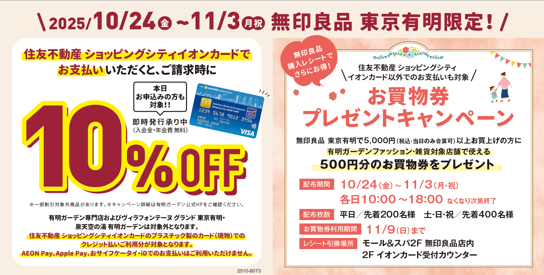 期間中、無印良品 東京有明限定で、住友不動産 ショッピングシティイオンカードでお支払いいただくと、ご請求時に10%OFF!