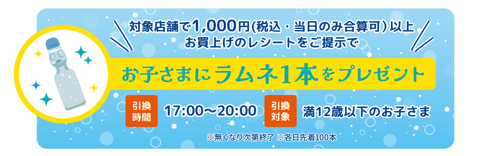 ※2,000円以上お買上げのレシートを1枚お持ちでも、一度の引換でプレゼントするのはレシート1枚につきラムネ1本までです。