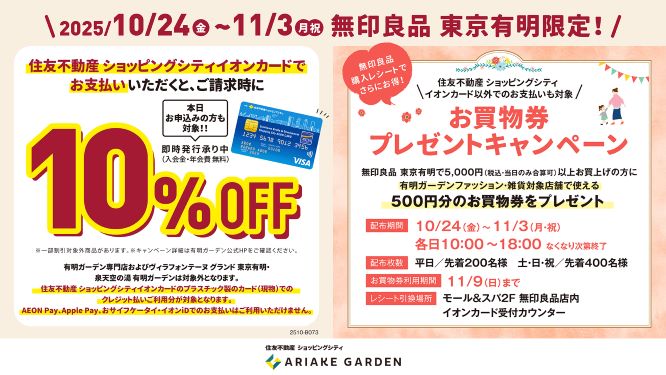 無印良品 東京有明にて期間中、「住友不動産 ショッピングシティイオンカード」でお支払いいただくと、ご請求時に10%OFFになるキャンペーンを開催いたします!