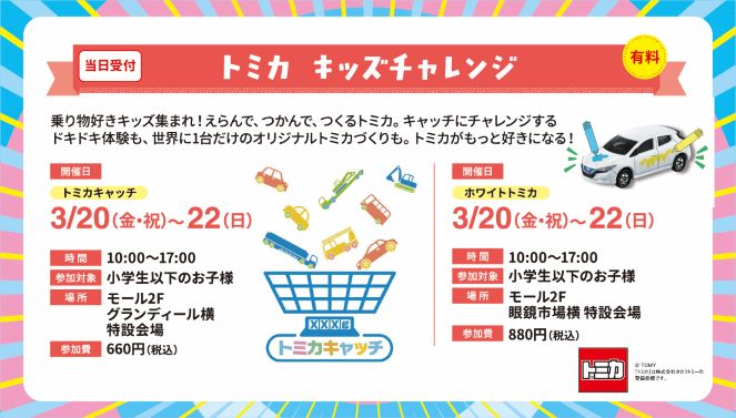 えらんで、つかんで、つくるトミカ。キャッチにチャレンジするドキドキ体験も、世界に1台だけのオリジナルトミカづくりも。トミカがもっと好きになる!