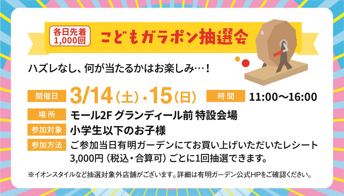 ご参加当日有明ガーデンにてお買い上げいただいたレシート3,000円(税込・合算可)ごとに1回抽選にご参加いただけます。