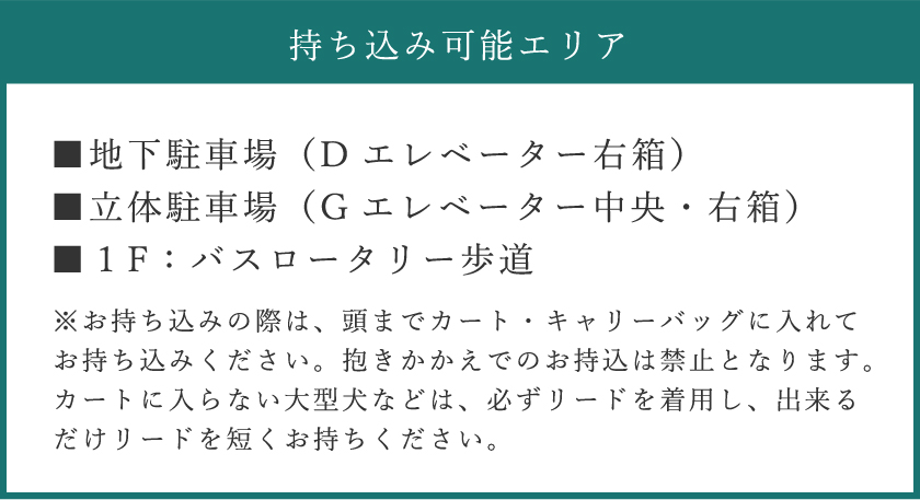 ■モール&スパ棟(Bエレベーター左箱/B1F~2F間) ※お持ち込みの際は、頭までカート・キャリーバッグに入れてお持ち込みください。抱きかかえでのお持込は禁止となります。カートに入らない大型犬などは、必ずリードを着用し、出来るだけリードを短くお持ちください。