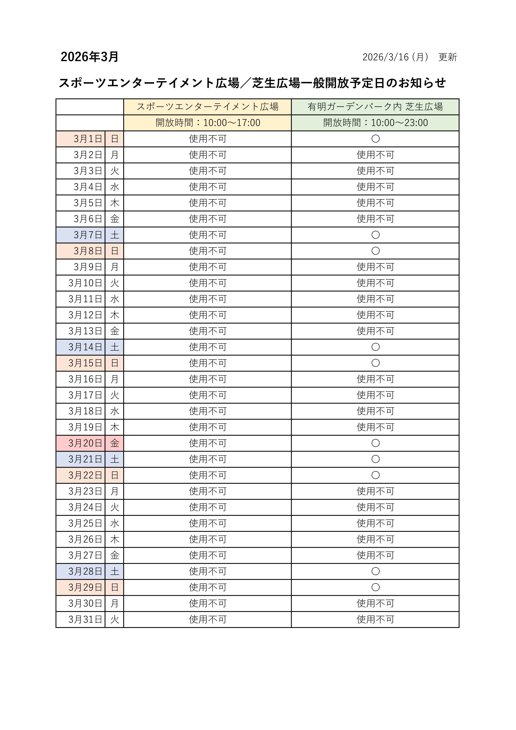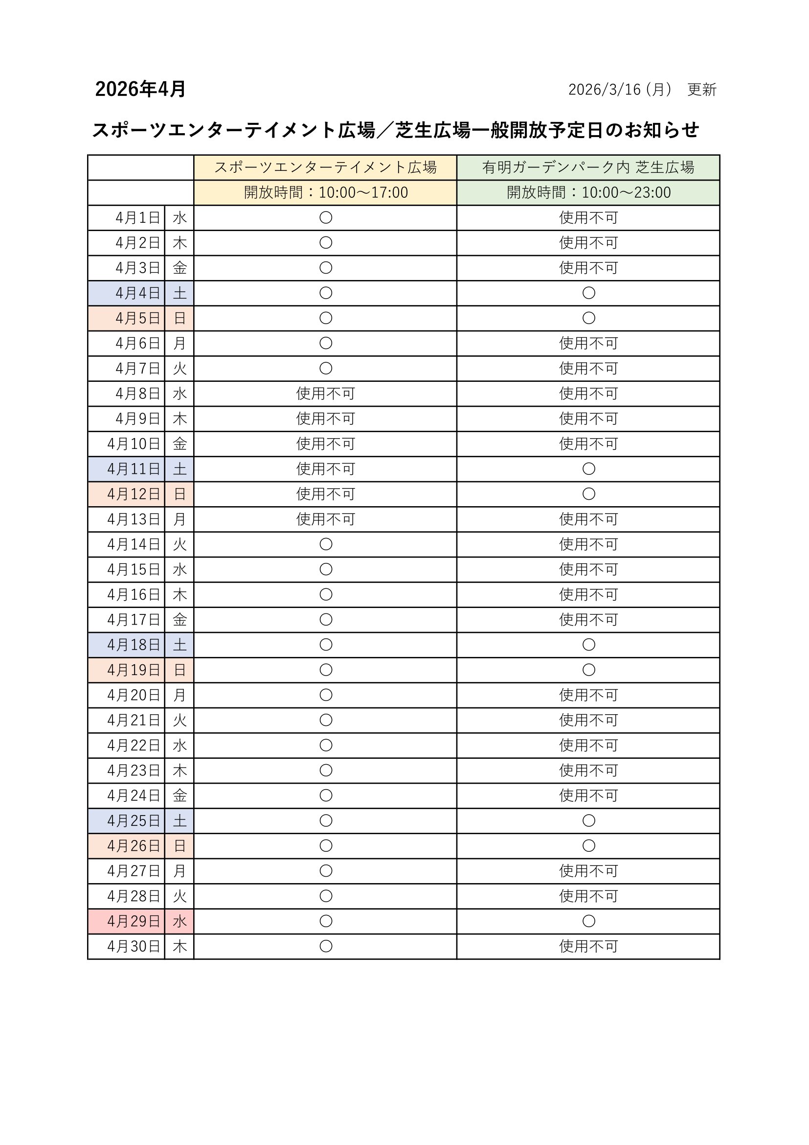 【3/16更新】スポーツエンターテイメント広場/芝生広場の一般開放予定日のお知らせ 2026年03月16日