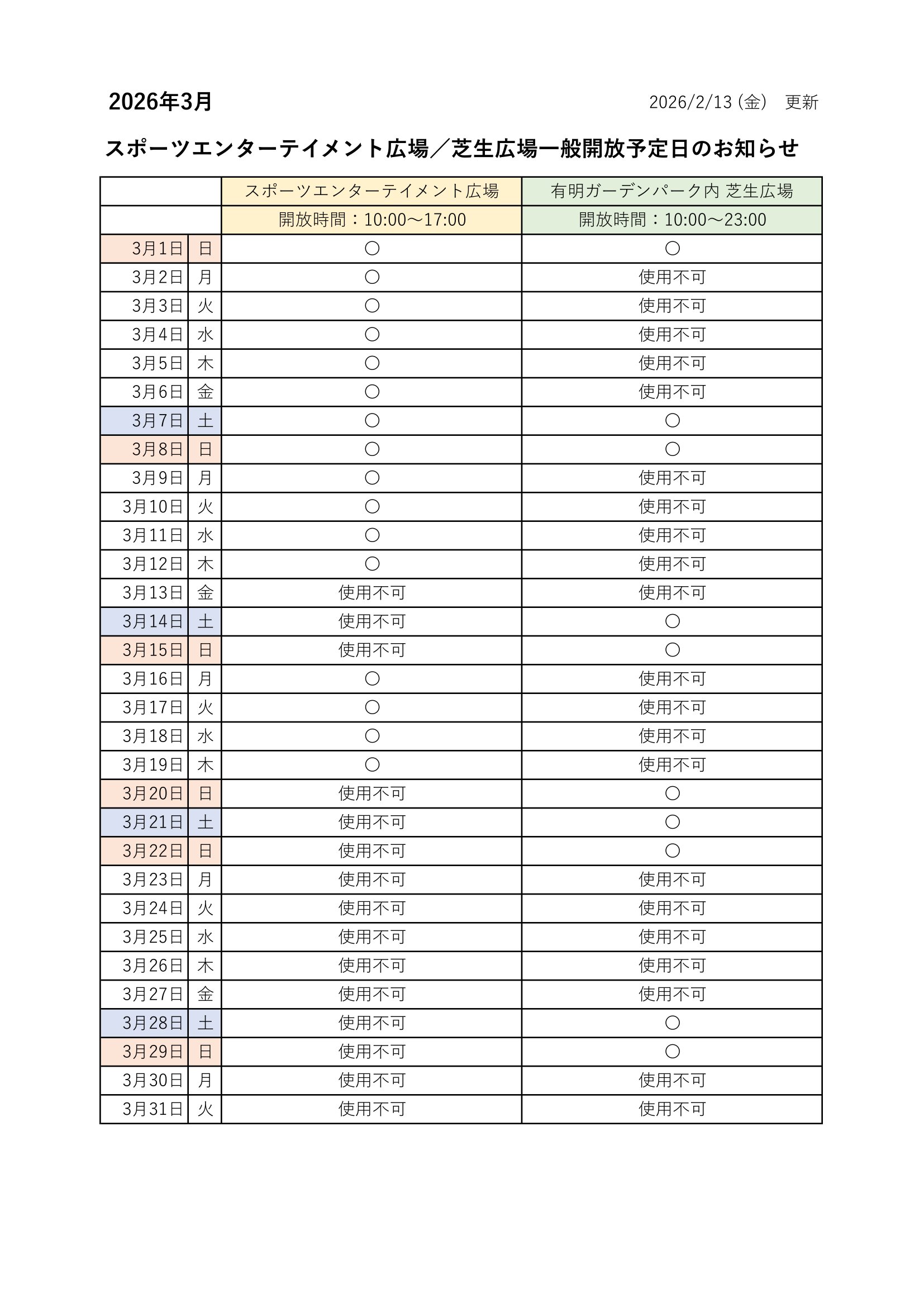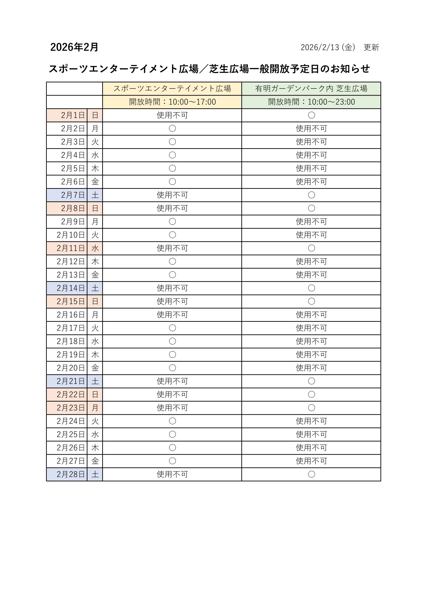 【2/13更新】スポーツエンターテイメント広場/芝生広場の一般開放予定日のお知らせ 2026年02月13日