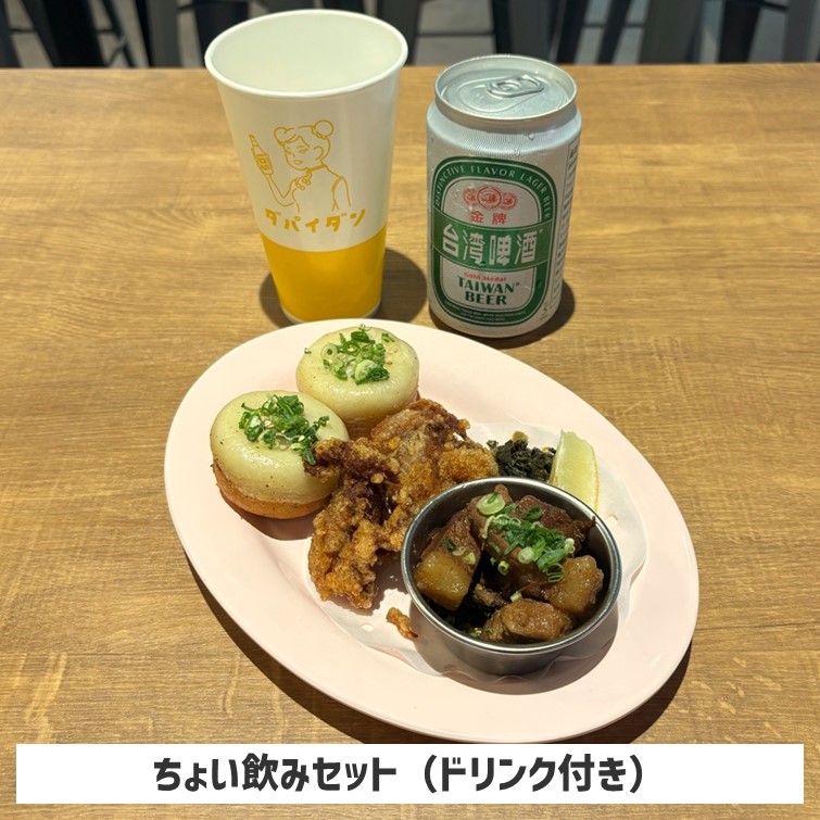 焼小籠包に台湾唐揚げなどを組み合わせた、ボリューム満点のメニューに、ドリンク1杯がついたセットです。