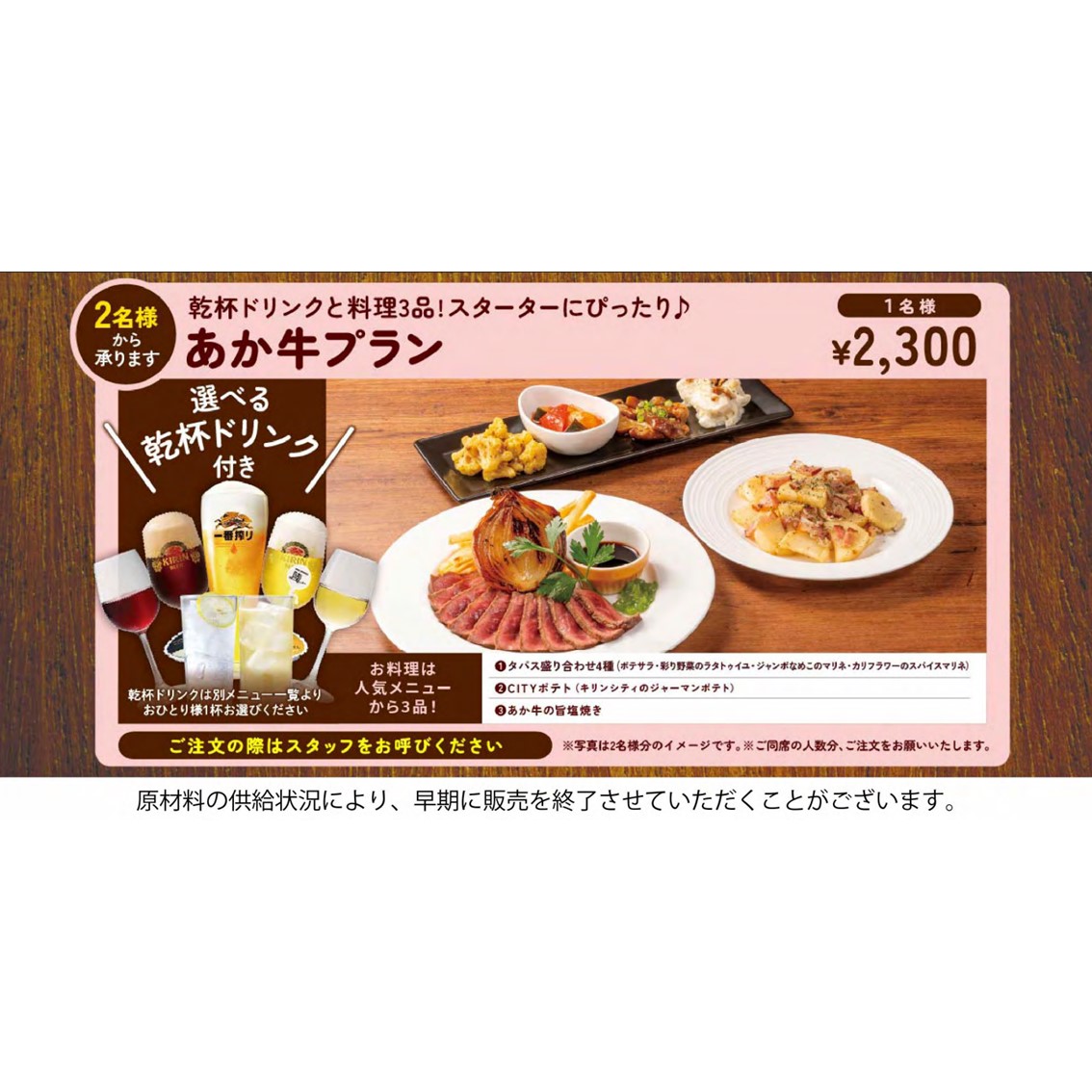 <【選べる乾杯ドリンク付】あか牛プラン(全3品)2,300円(税込)>