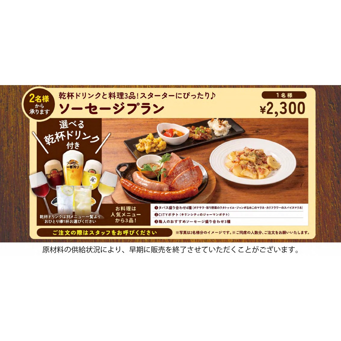<【選べる乾杯ドリンク付】ソーセージプラン(全3品)2,300円(税込)>