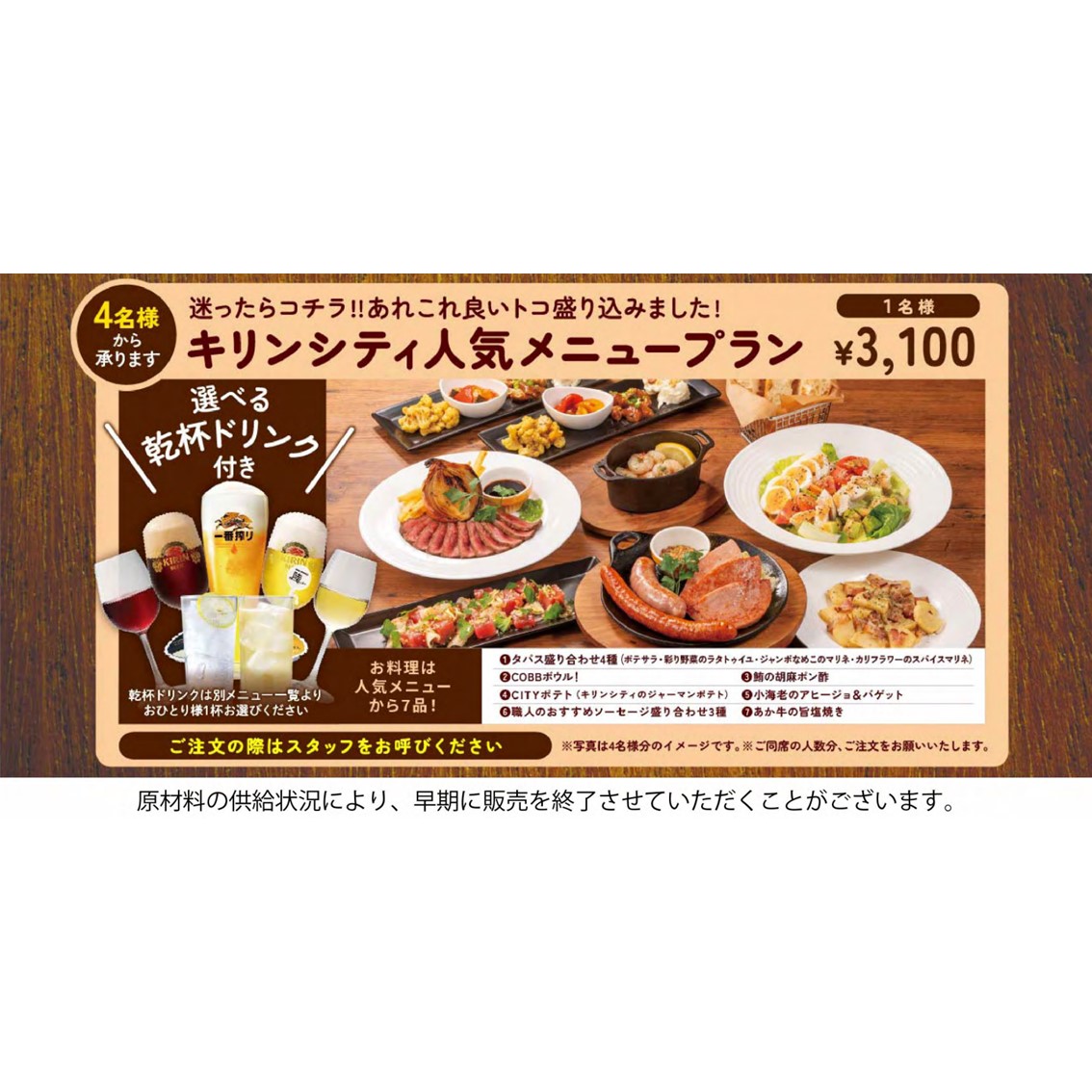 <【選べる乾杯ドリンク付】キリンシティ人気メニュープラン(全7品)3,100円(税込)>
