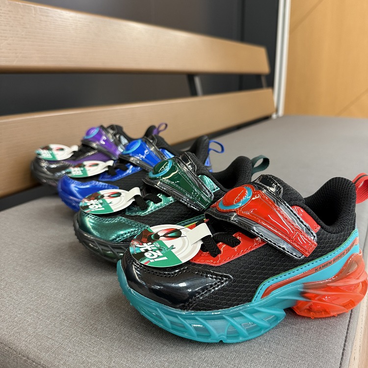 仮面ライダー史上初となる、“ 胸に巻く変身ベルト ”「 ゼッツドライバー 」 をモチーフに、シューズベルトをななめに取り付けた 本商品 は、歩くたびに振動によってベルト部分が光る仕掛けが施されています !!
