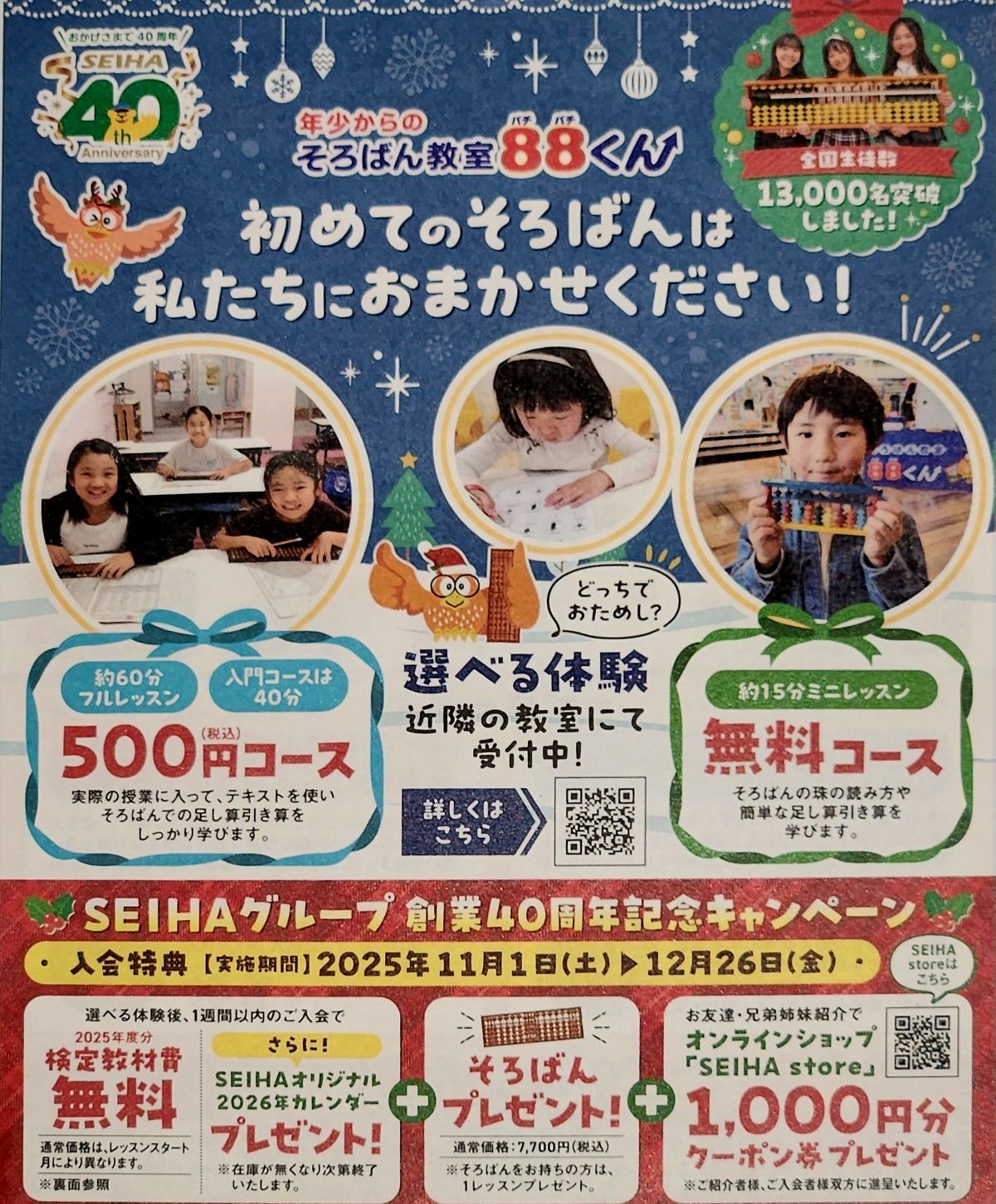 (そろばんをお持ちの方は、1レッスンプレゼント)