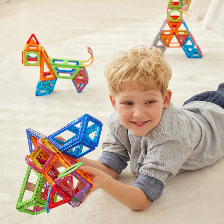 数学センスを育む磁石ブロック。14種類の図形に車輪やカーブなど多彩なパーツが揃い、収納BOX付きの人気セットです。