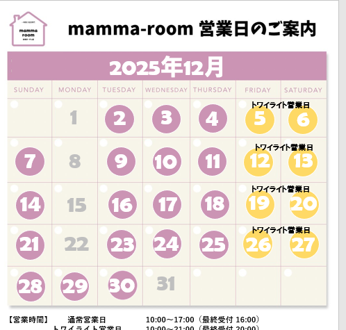 mamma-roomの年末の営業は30日までとなっております。29日月曜日は通常ですと定休日ですが、年末のお忙しい時間に一息つけますよう託児をご利用くださいませ。カレンダーをご確認の上、ぜひたくさんのご利用をお待ちしております!