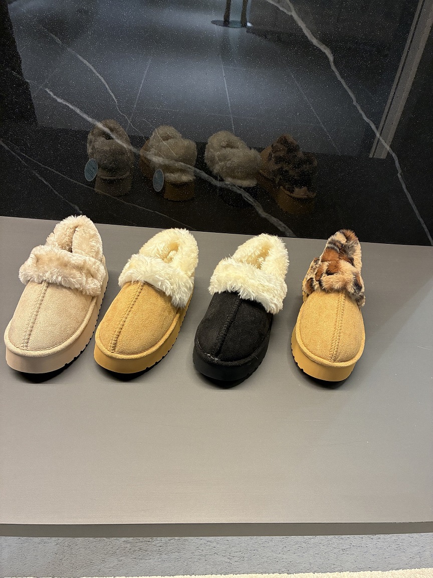 トレンドのムートン風素材を使用したストラップ付きミュールデザイン