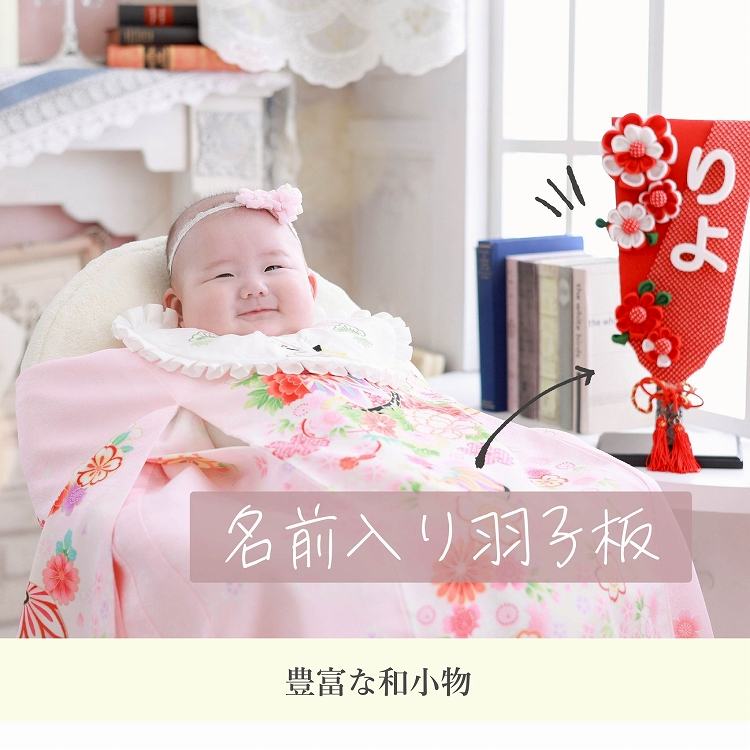 和装撮影をさらに特別なものにしてくれるのが、和小物の存在。豊富にご用意した小物を組み合わせることで、写真に動きや物語が生まれ、表情の幅もぐっと広がります。また、人気の名前入り羽子板で特別な演出が可能です♪