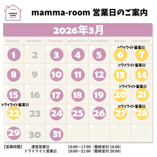 ママが甘えていい場所、mamma-room有明ガーデン店、3月の営業スケジュールをお知らせいたします。
