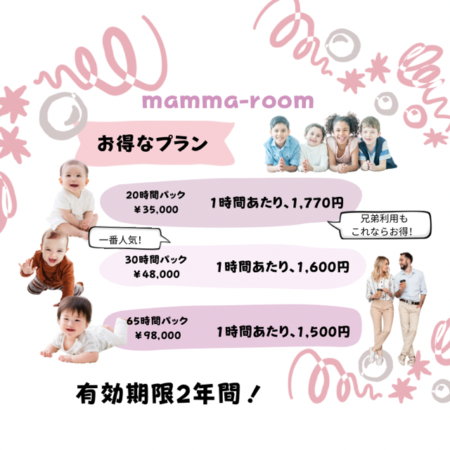 保育園、幼稚園に入園した後もmamma-roomに遊びにきて頂きたい、想いを込めて、人気の託児チケット(各料金)の有効期限を1年▶︎2年に延長いたします。