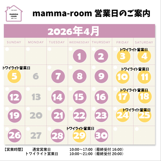 ママが甘えていい場所、mamma-room有明ガーデン店、4月の営業スケジュールをお知らせいたします。