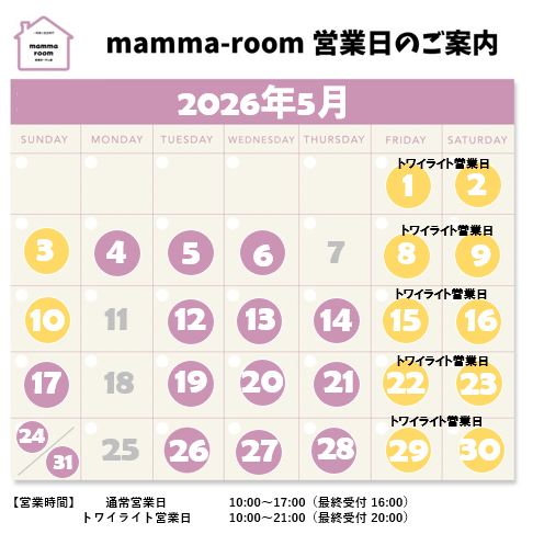 ママが甘えていい場所、mamma-room有明ガーデン店、5月の営業スケジュールをお知らせいたします。GWは休まずmamma-roomはお子様をお待ちしております!