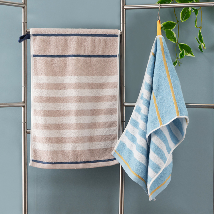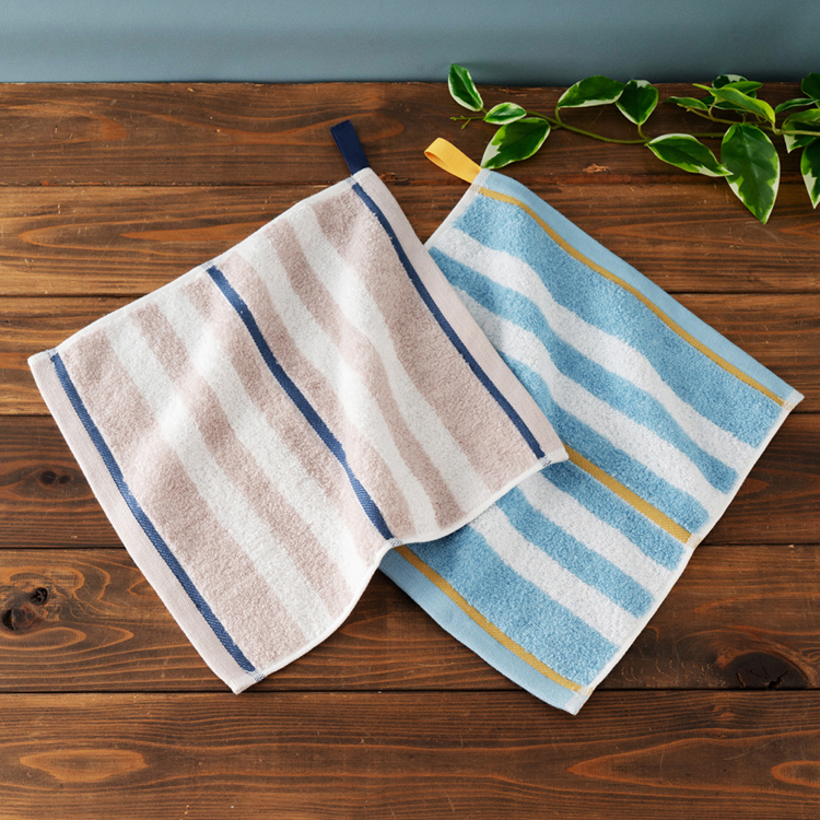 澄んだ北欧の風をイメージした穏やかなベージュと爽やかブルーのボーダー柄タオルです。