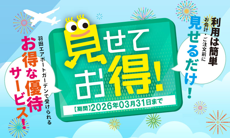 『見せてお得』は、対象のカードやレシートを見せるだけで、館内ショップやレストランをお得に利用できるサービスです。2025シーズン川崎フロンターレ後援会にご入会の方は、羽田エアポートガーデン内の約40店舗で優待サービスが受けられます。なお、デジタル会員証も対象となります。※2025年12月31日まで。
