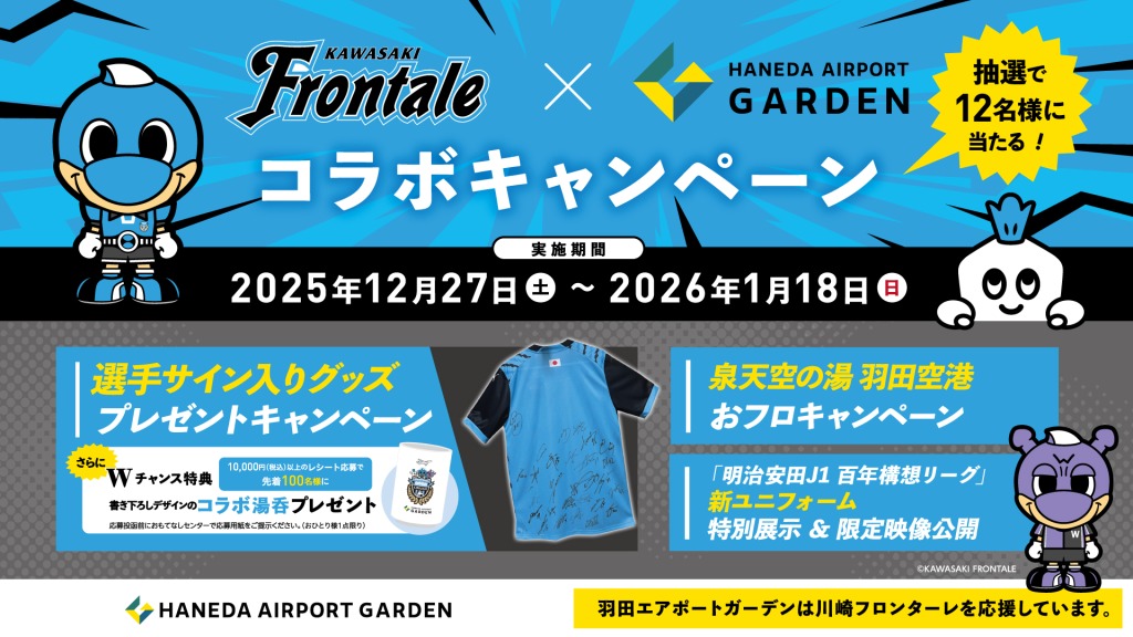 期間中、羽田エアポートガーデン館内の対象店舗にて税込5,000円以上お買い上げいただいたお客様を対象に、抽選で12名様に複数選手の直筆サイン入りグッズをプレゼントします。