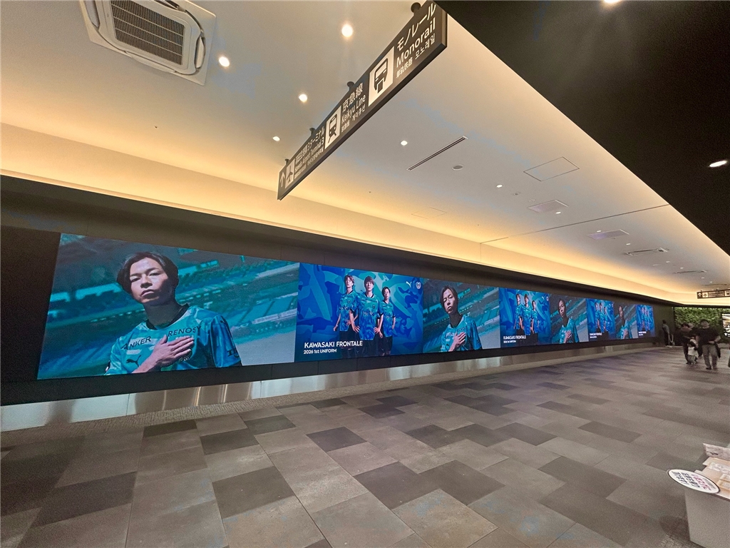 下段画像(2024年10月/2024年12月~2025年1月):サイネージ放映企画の様子 @KAWASAKI FRONTALE