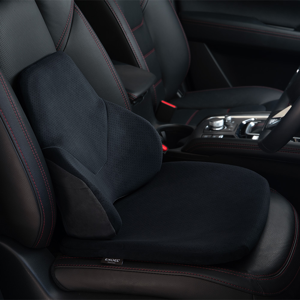 腰椎、仙骨、骨盤を支持する形状で、運転中の姿勢を安定させ、骨に当たる部分にはエクスジェルを配置し圧力を分散、腰や背中のご負担を軽減します。