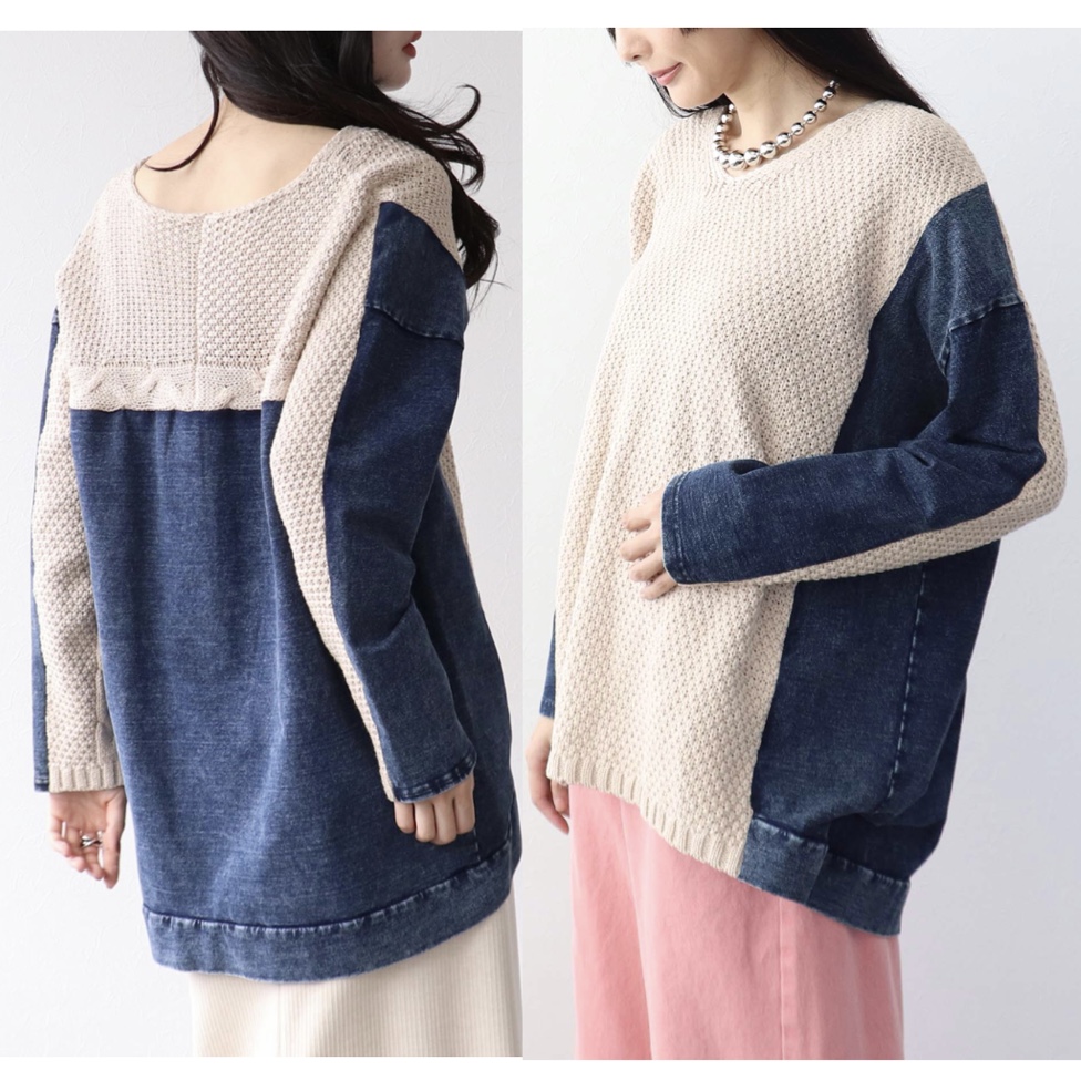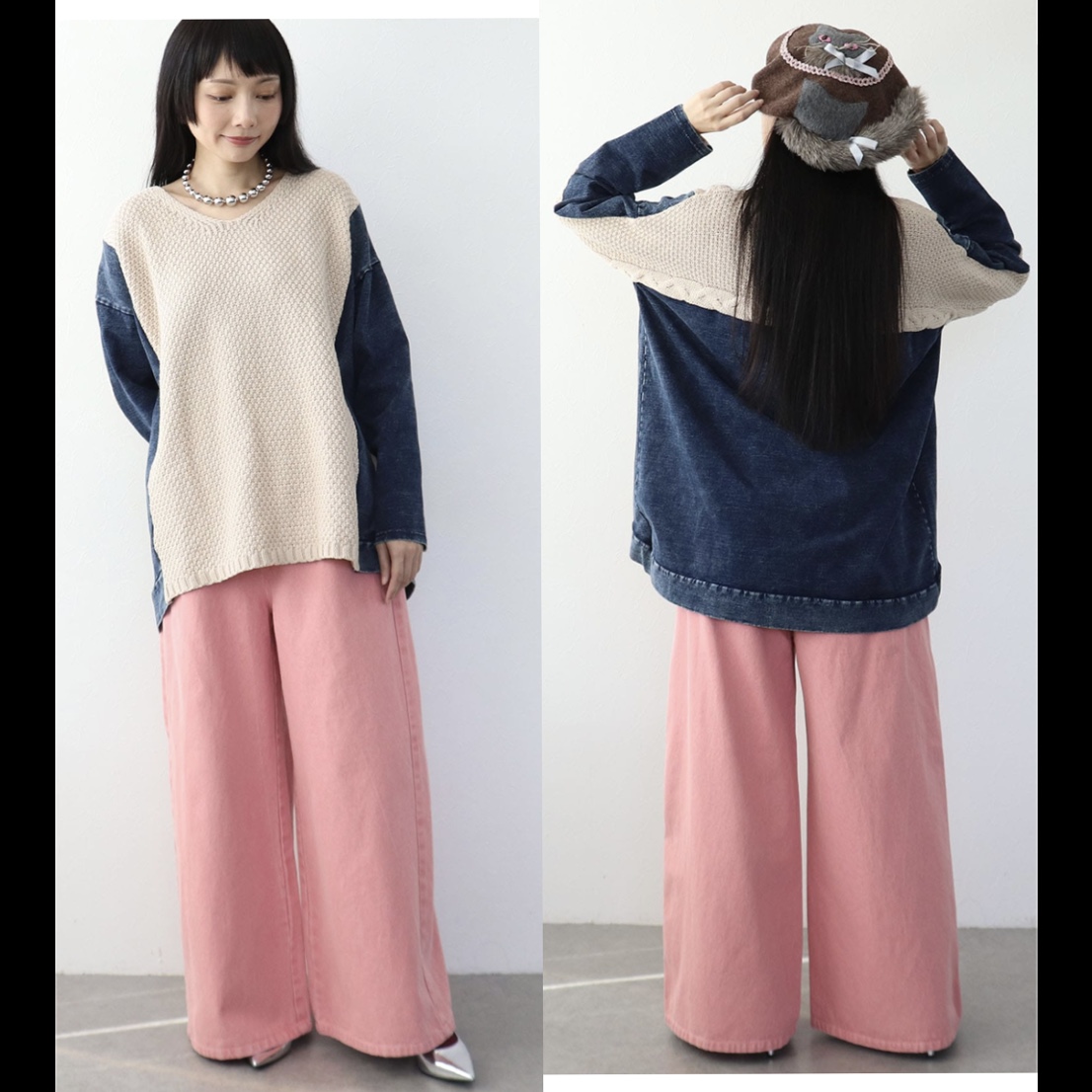 サイドから背中にかけて切り替えられたニット×デニムのデザインに