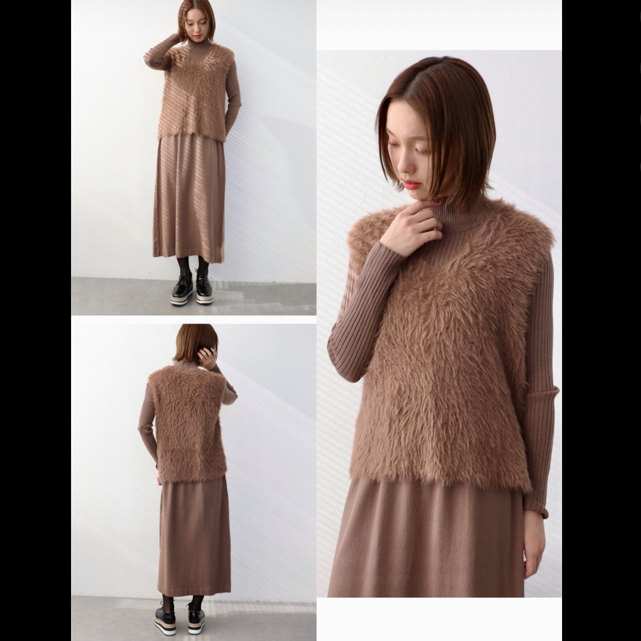 ニットワンピースは身頃部分はリブニットですっきりとさせつつ