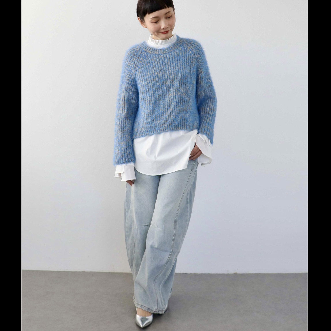 ブルーを基調にしたミックスカラーで暗くなりがちな冬のコーデも
